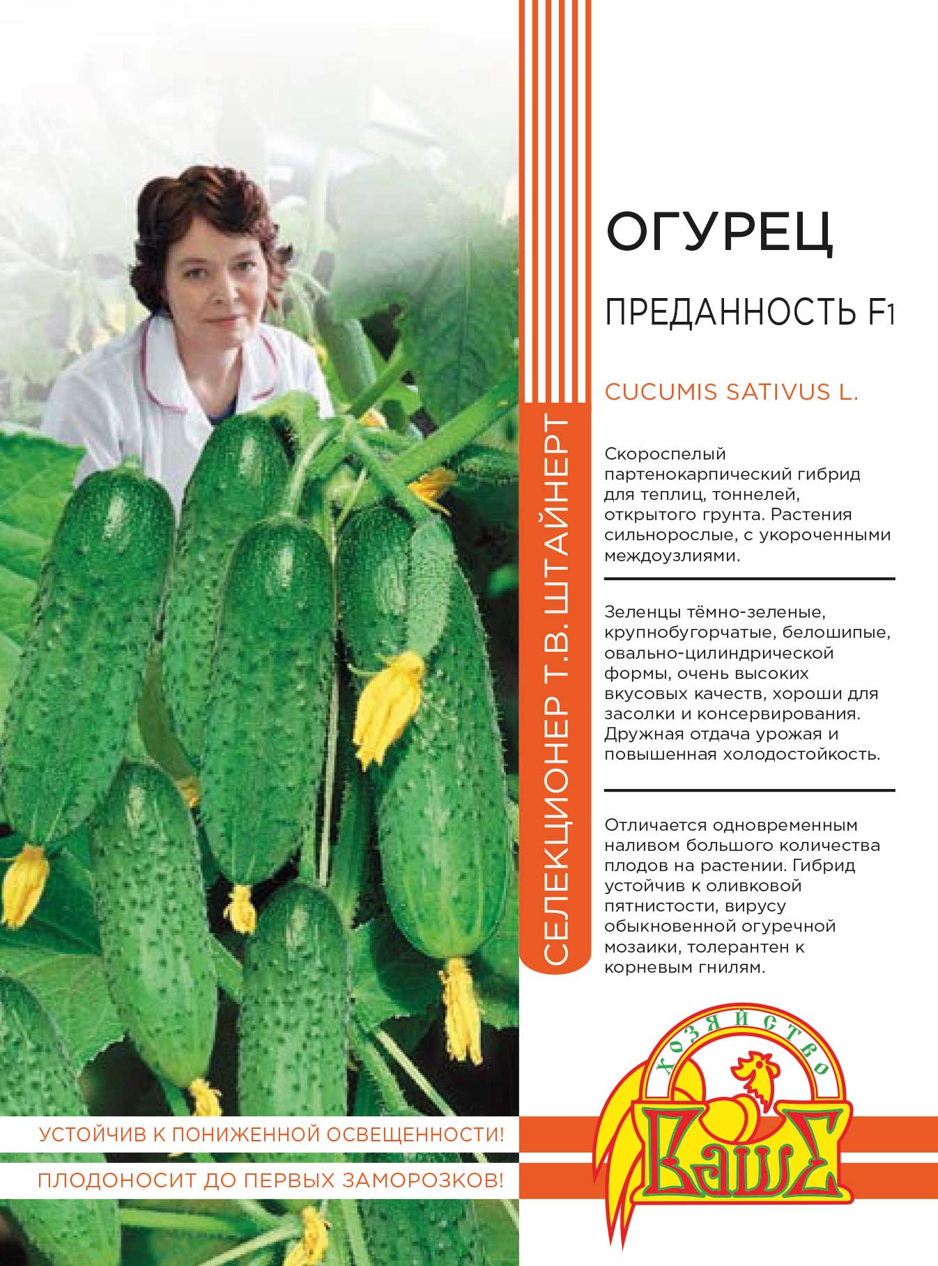 Среднеранний гибрид для открытого грунта и парников, преимущественно женского типа цветения. Зеленцы зеленого цвета, мелкобугорчатые, длинной б-9 см, генетически без горечи, высоких вкусовых качеств в свежем и консервированном виде. Гибрид устойчив к вирусу огуречной мозаики и мучнистой росе. Ценность сорта: стабильная урожайность, высокая товарность, продолжительный период плодоношения даже при неблагоприятных погодных условиях.